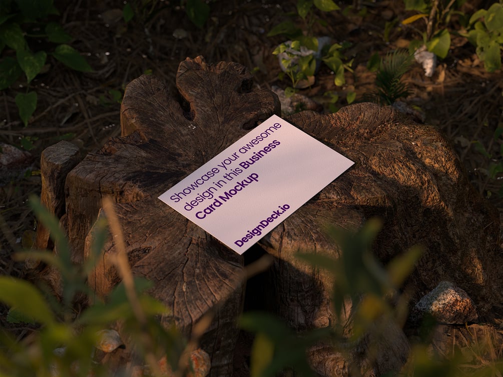 Business card mockup amidst lush, green foliage, placed on a tree trunk. The natural setting creates a vibrant and organic atmosphere. This natural environment makes the mockup ideal for showcasing creative design projects in a unique and visually appealing context, especially in the area of wellness.