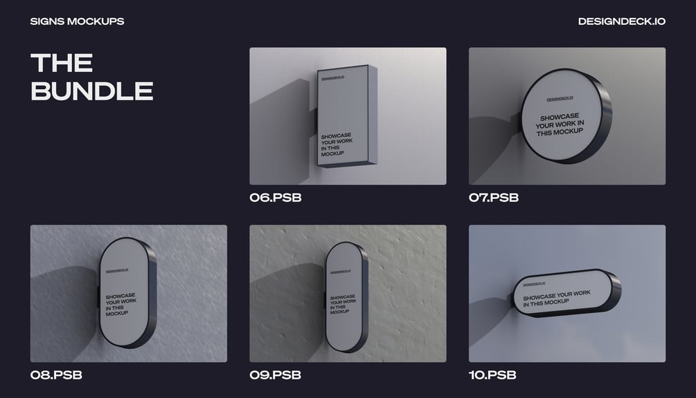 This bundle includes 14 PSD mockups of different shape of signs. Sized at 6000 px × 4500 px with 300dpi