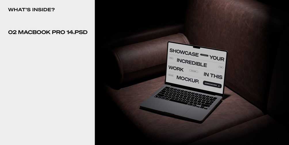 Vol 20 features a variety of dark-themed mockups of Macbook Pro in both 14 and 16 inch.