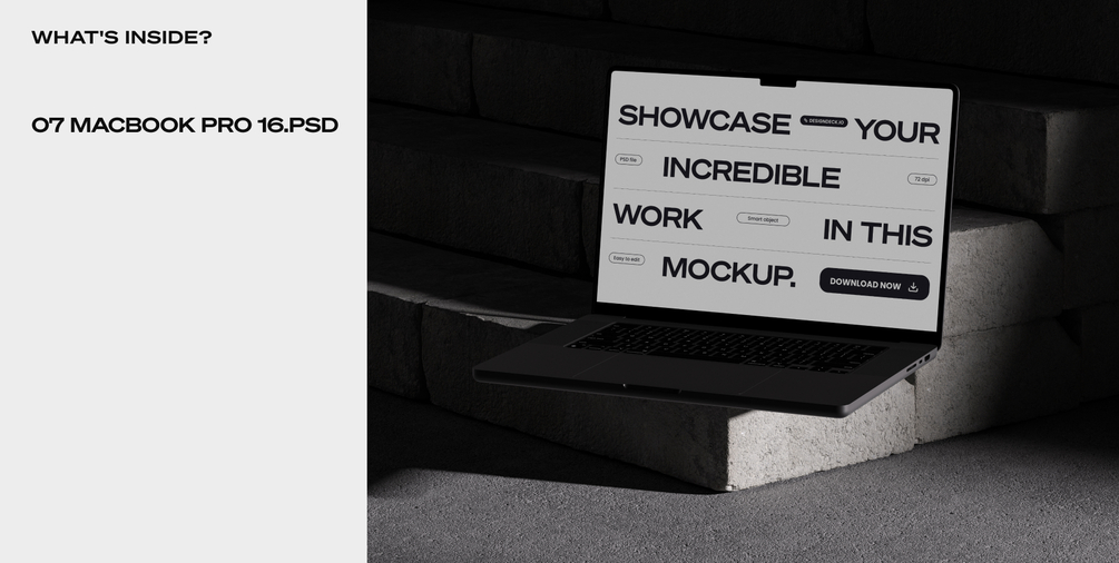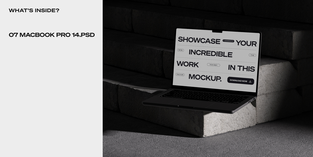 Vol 20 features a variety of dark-themed mockups of Macbook Pro in both 14 and 16 inch.