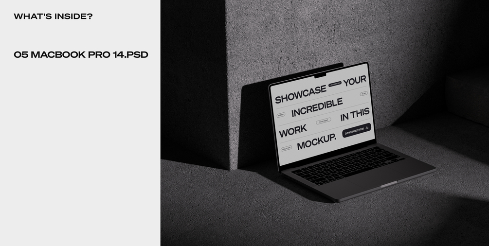 Vol 20 features a variety of dark-themed mockups of Macbook Pro in both 14 and 16 inch.