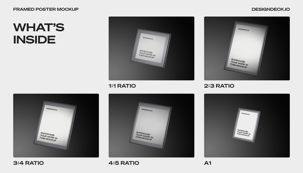 This bundle includes 10 PSD Mockups of Framed Poster with Ratio of 1:1 - 2:3 - 3:4 - 4:5 - A1 Sized at 6000 px × 4500 px with 300dpi.