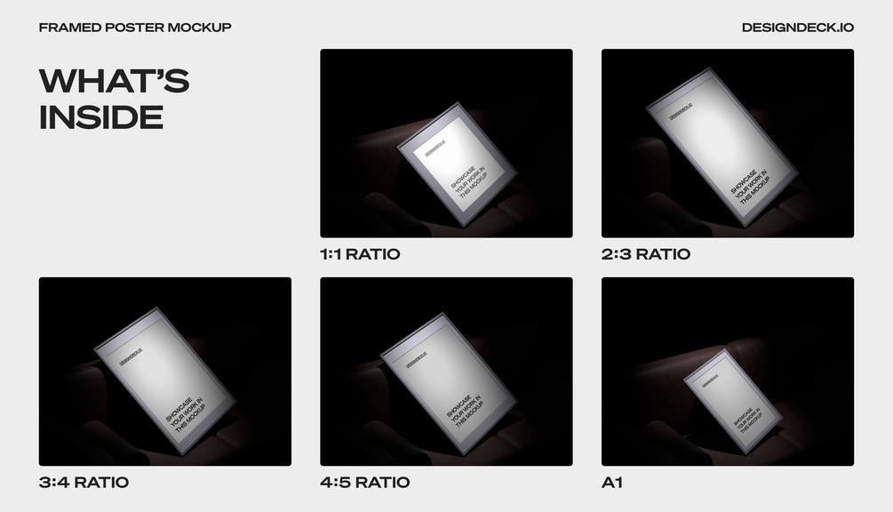 This bundle includes 5 PSD Mockups of Framed Poster with Ratio of 1:1 - 2:3 - 3:4 - 4:5 - A1 Sized at 6000 px × 4500 px with 300dpi.