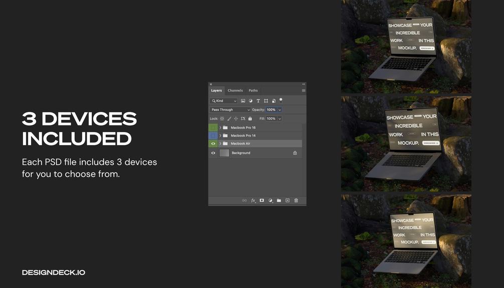 Each PSD file includes 3 devices of Macbook 14, Macbook 16, and Macbook Air for you to choose from.